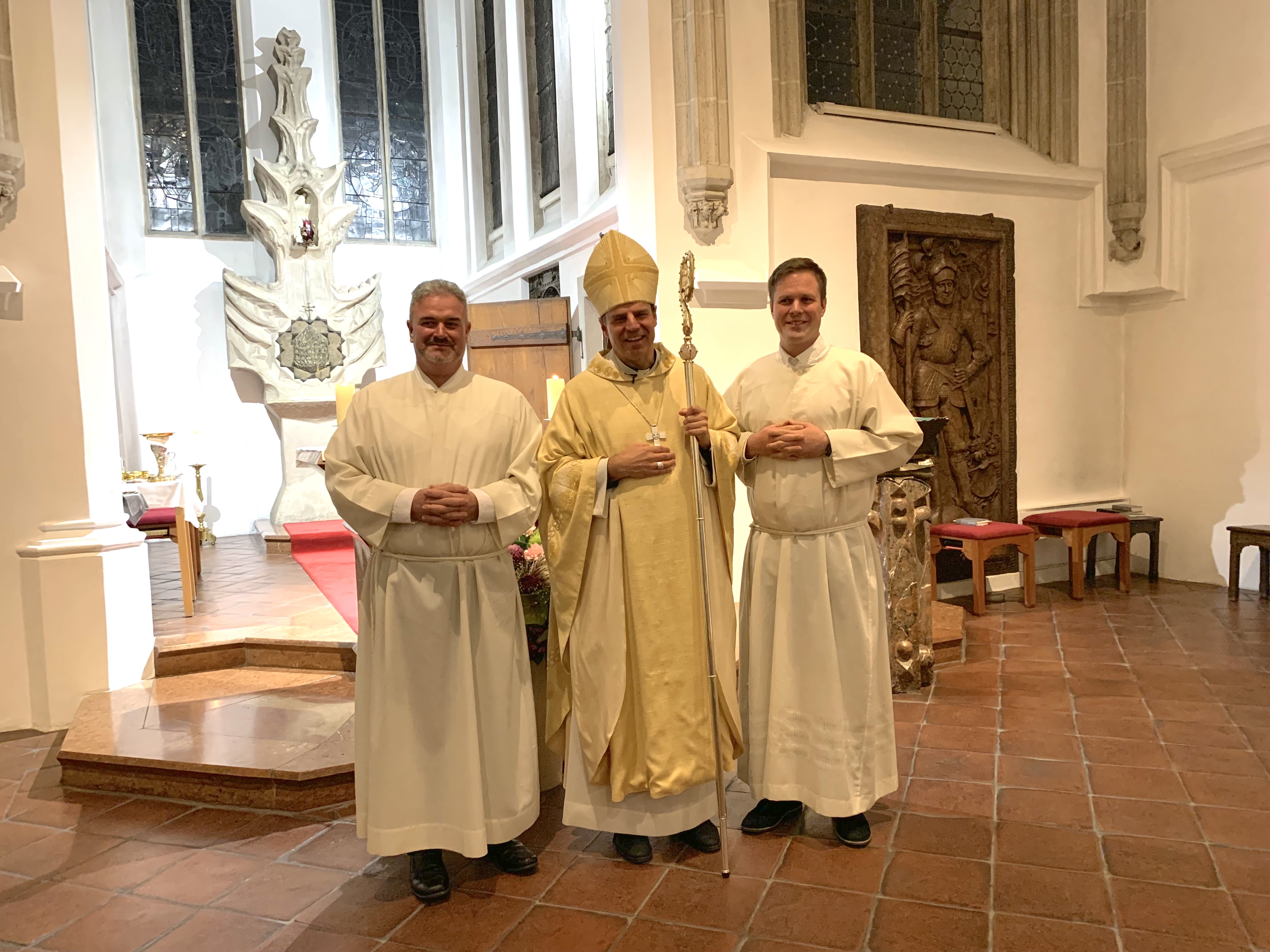 Auf dem Weg zur Weihe zum Ständigen Diakon haben heute am Abend Korbinian Zelger und Sebastian Albert die Zulassung zum Lektor und zum Akolythen gefeiert. Im Beisein von Freunden, Weggefährten, Familien und Ortspfarrern überreichte Bischof Stefan den beiden Kandidaten sowohl das Wort Gottes wie auch Kelch und Hostienschale als Symbole für den künftigen Dienst. In seiner Predigt (zu den Texten Weish 13,1-9 und Lk 17,26-37) sprach der Bischof über die Erkenntnis Gottes aus seinem Wort und über Verinnerlichung und Vergegenwärtigung seiner Liebe im Dienst. Die Predigt kann unten nachgehört und heruntergeladen werden.