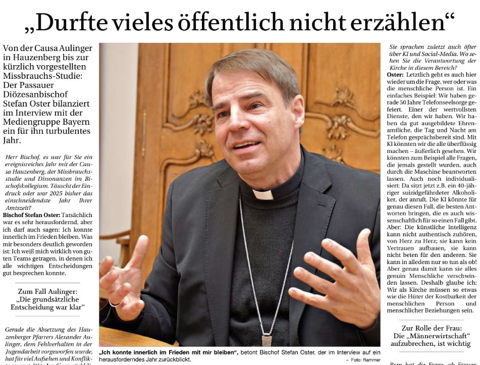 Im Interview mit der Mediengruppe Bayern zog Bischof Stefan Oster Bilanz über das vergangene Jahr; dabei sprach der Bischof mit Martin Wanninger und Dr. Stefan Rammer über die Causa Hauzenberg, die Aufarbeitungsstudie, kirchenpolitische Themen und seine Gedanken zu Weihnachten. Das gesamte Interview finden Sie hier.